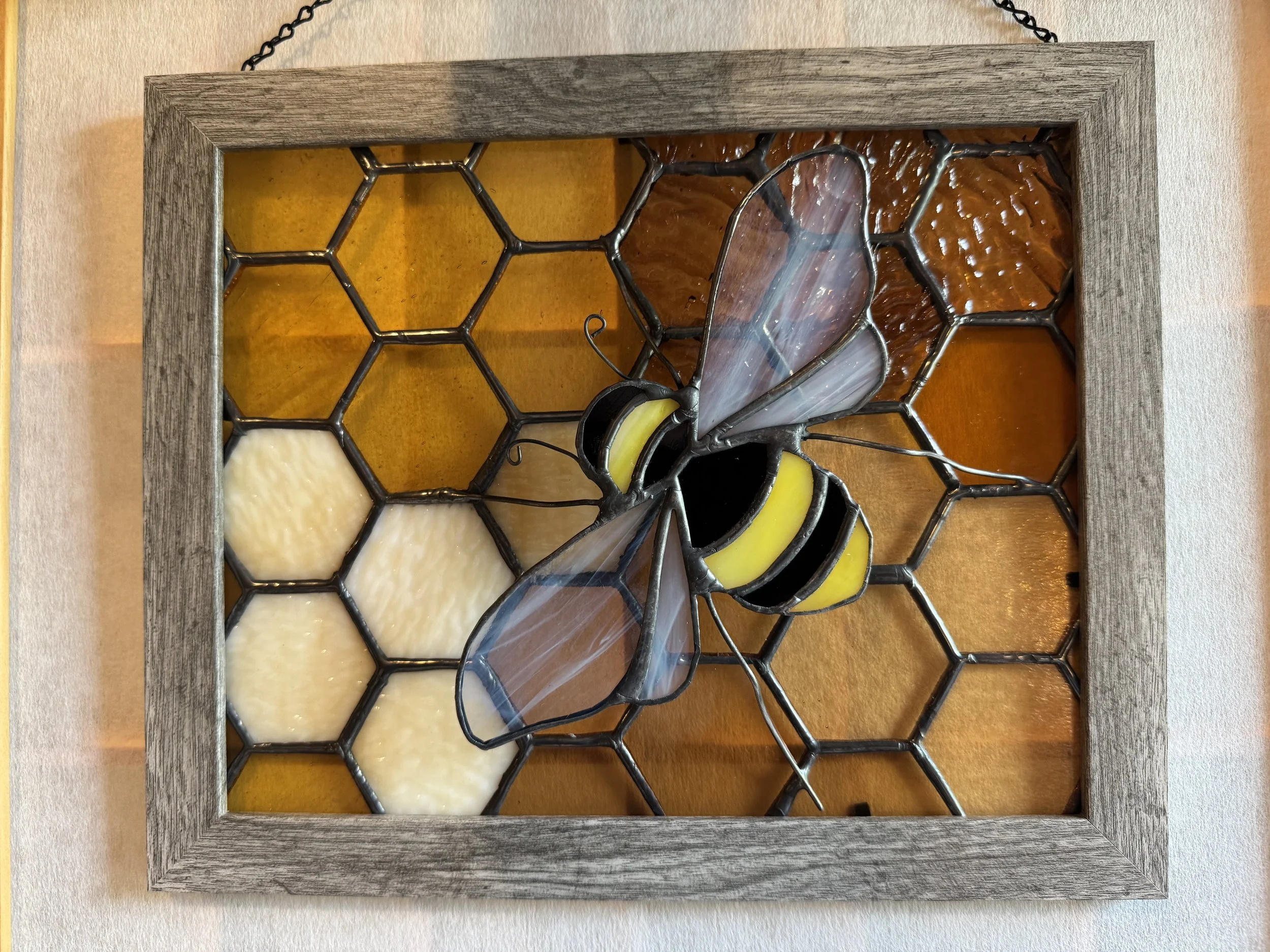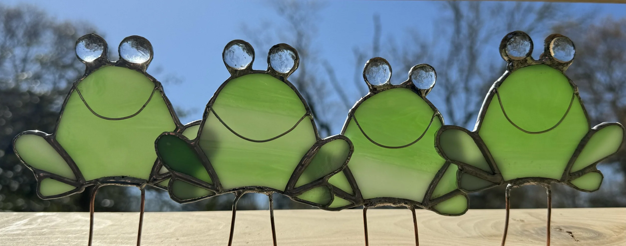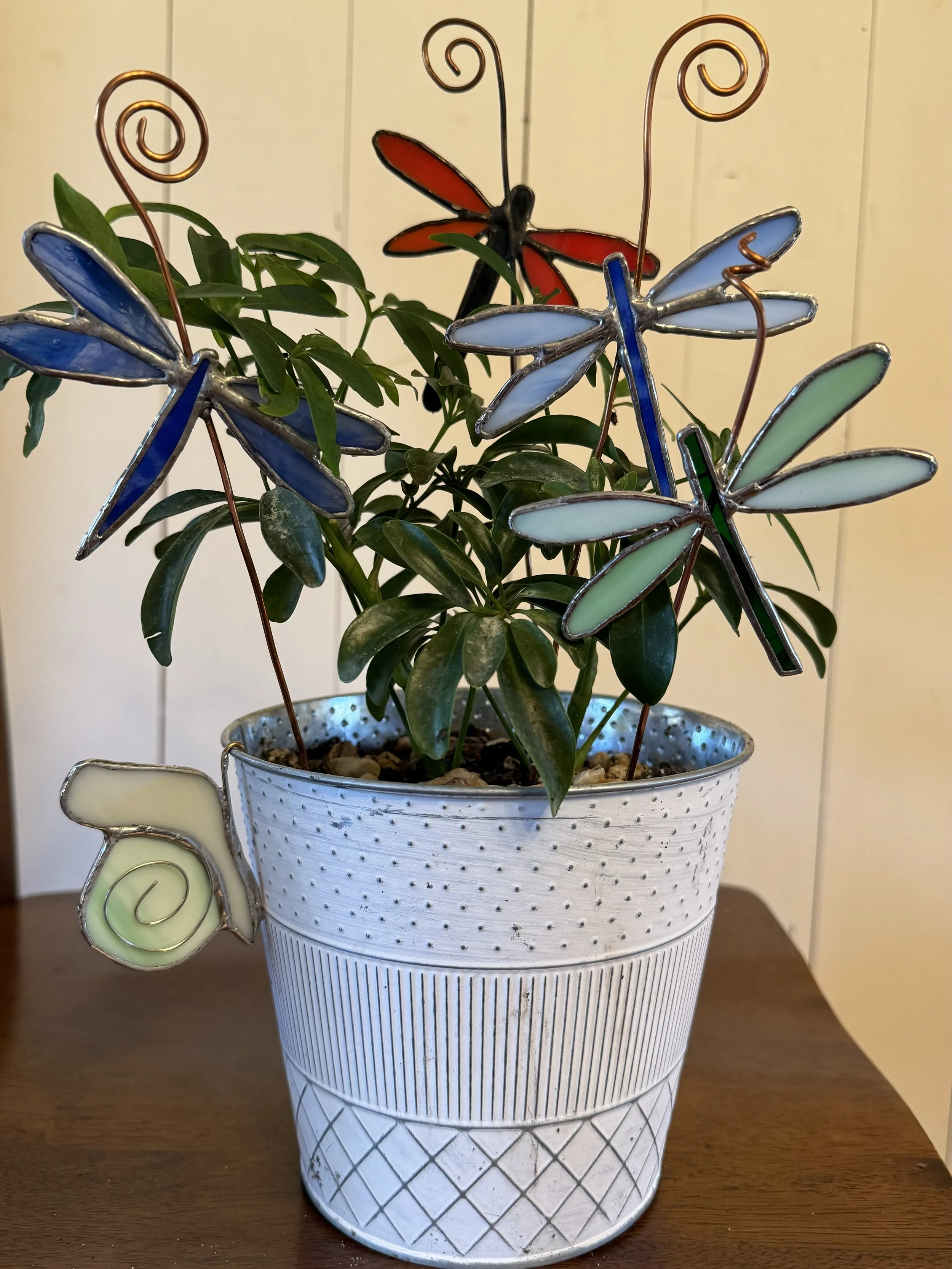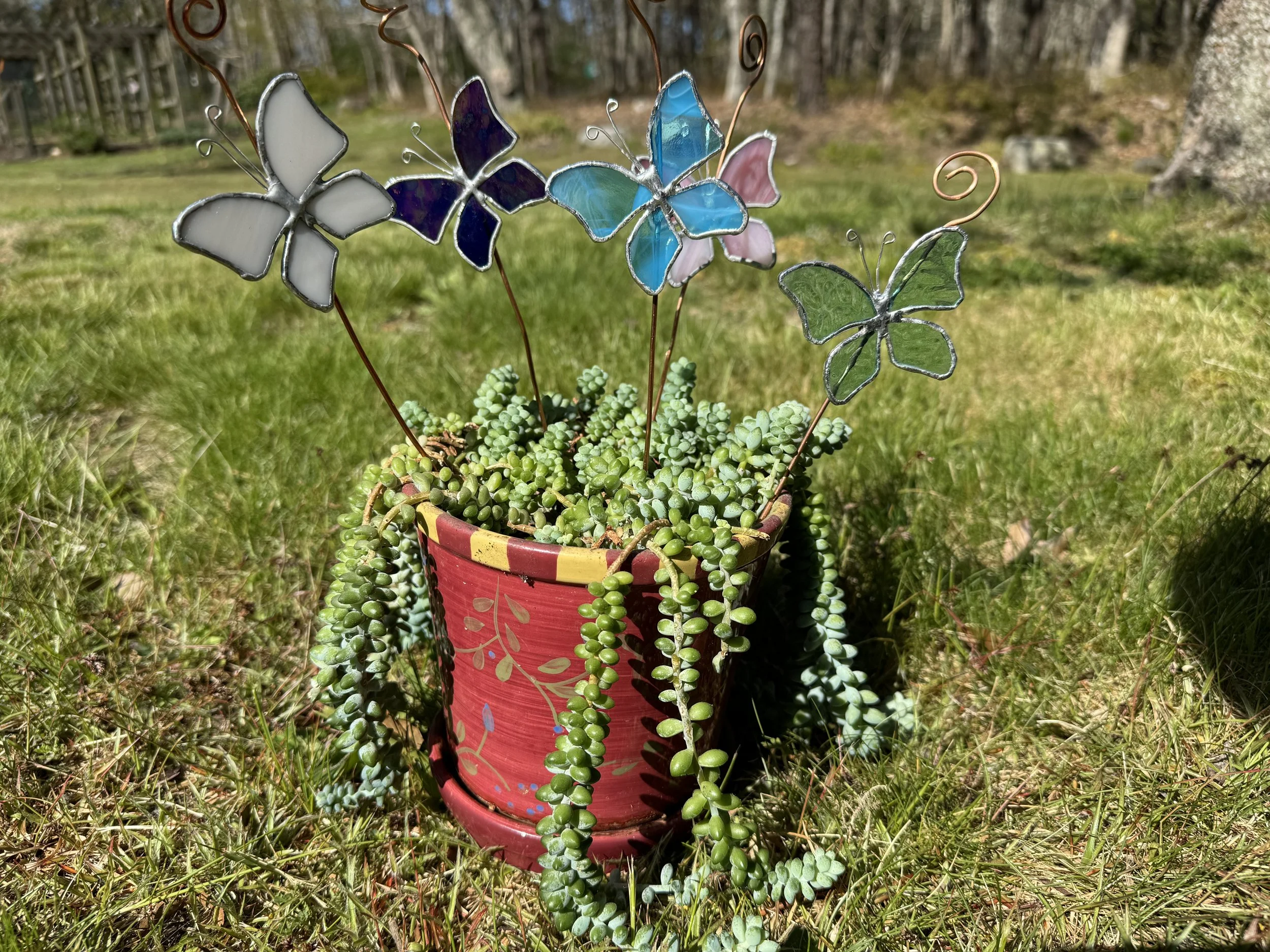 Karin makes a wide variety of stained glass pieces including plant stakes, spinners, garden decor, panels, bookends, three-dimensional pieces, and more. There are rarely more than a few of each item, with many pieces being one-of-a-kind. While some items are shown here, she regularly updates Instagram and Facebook with new creations.