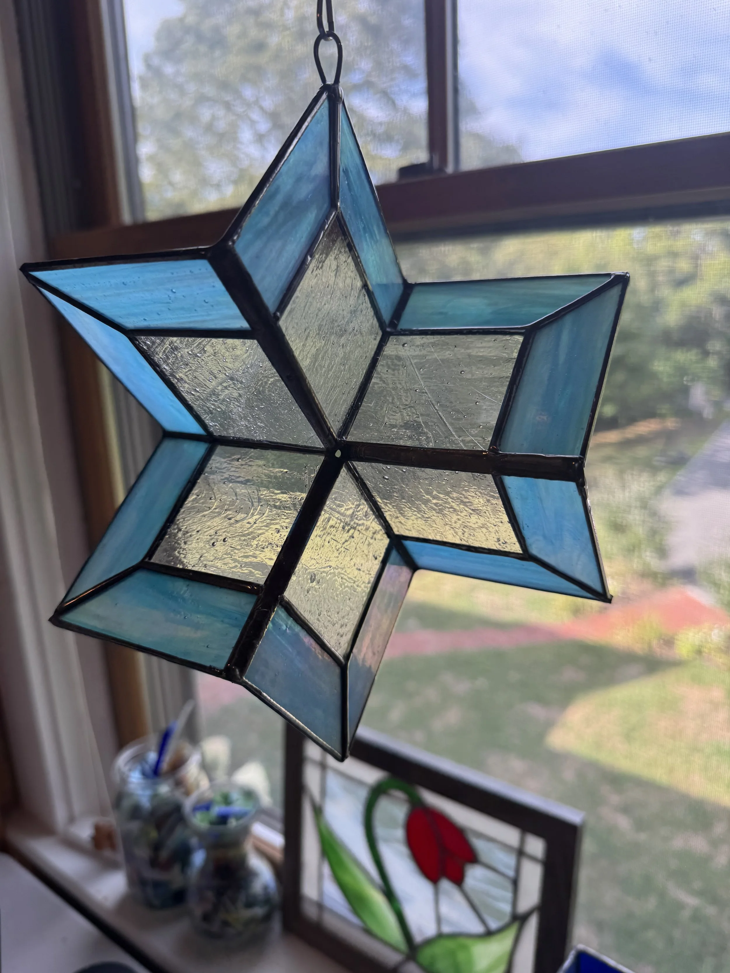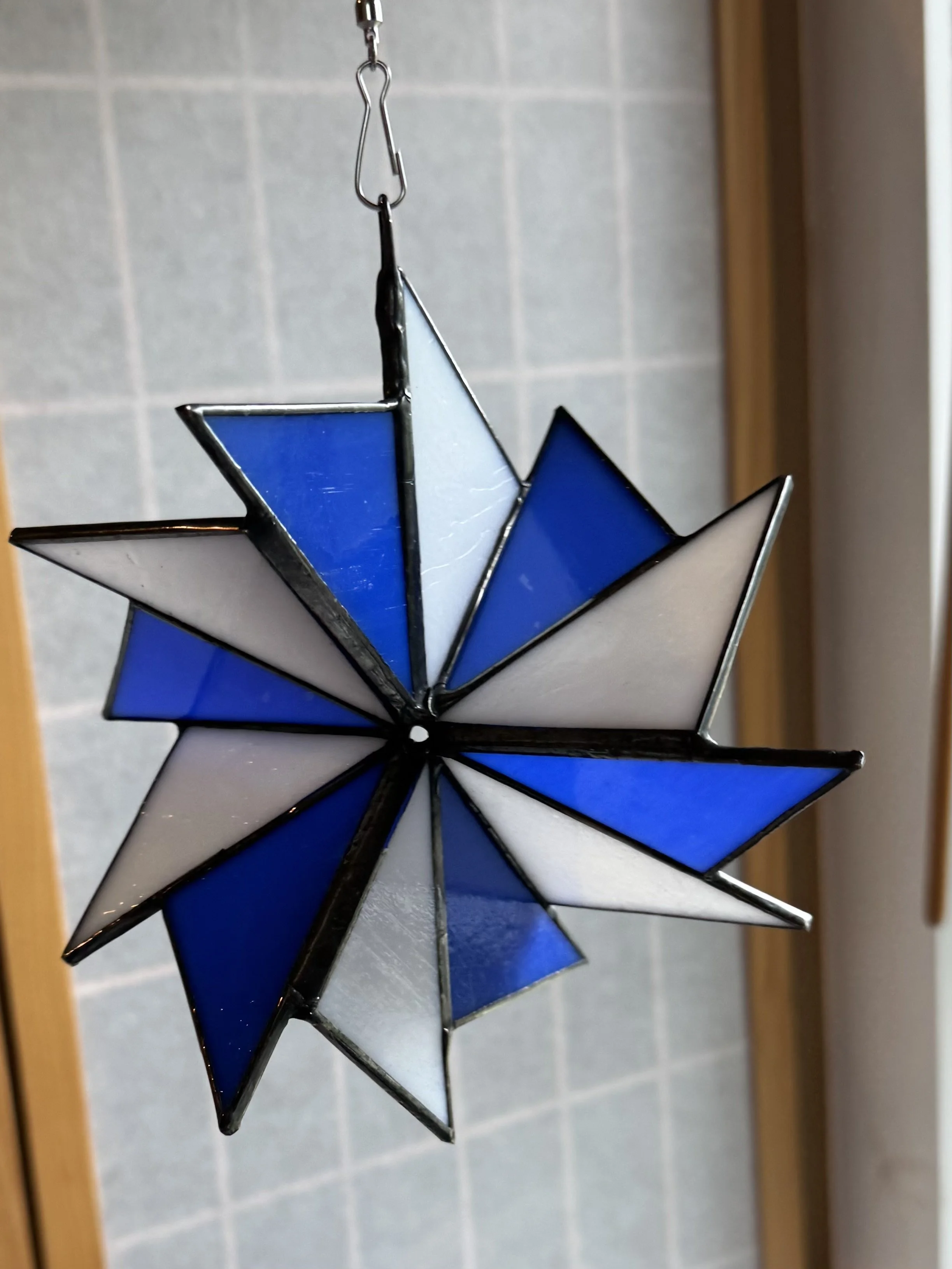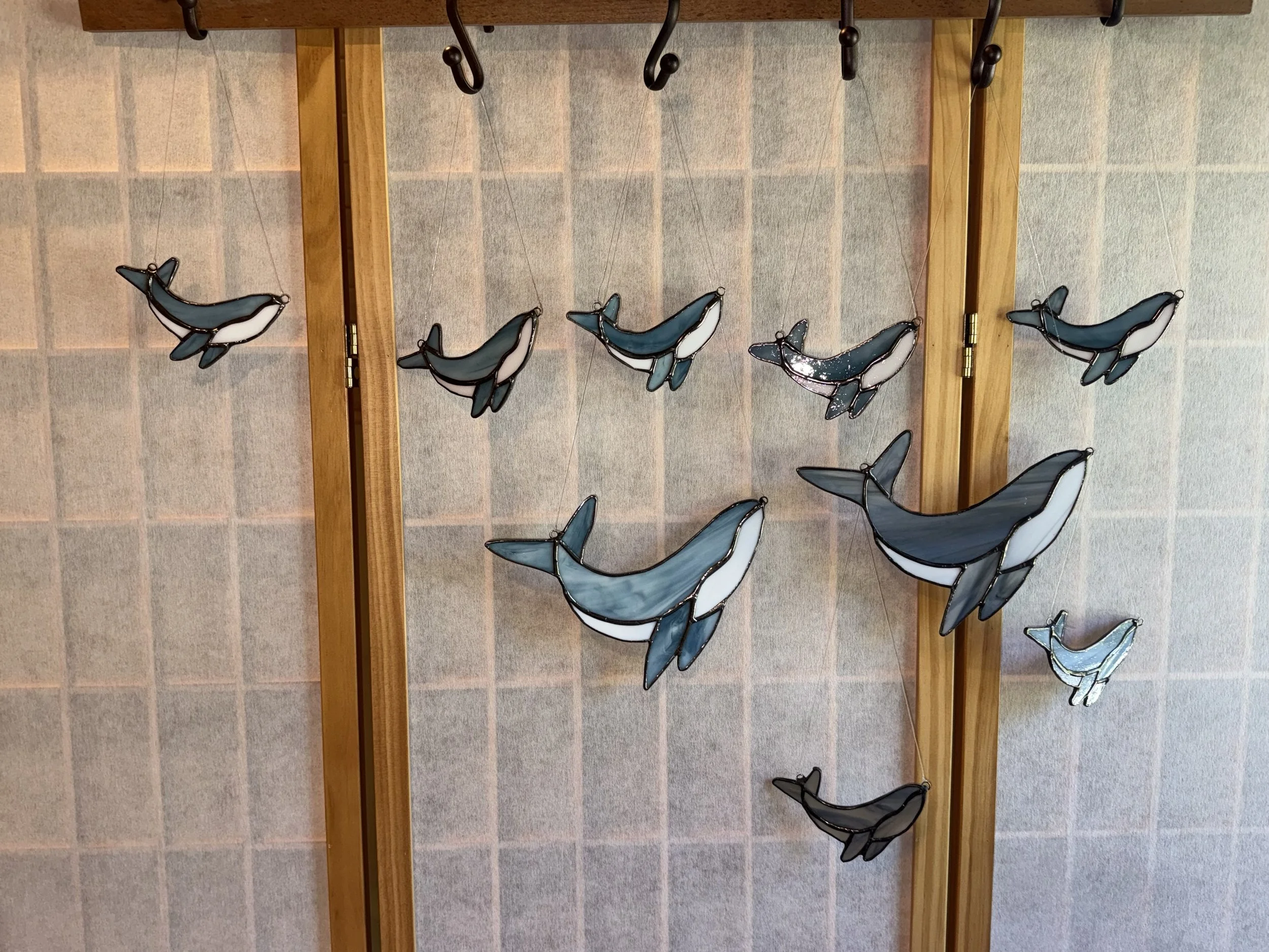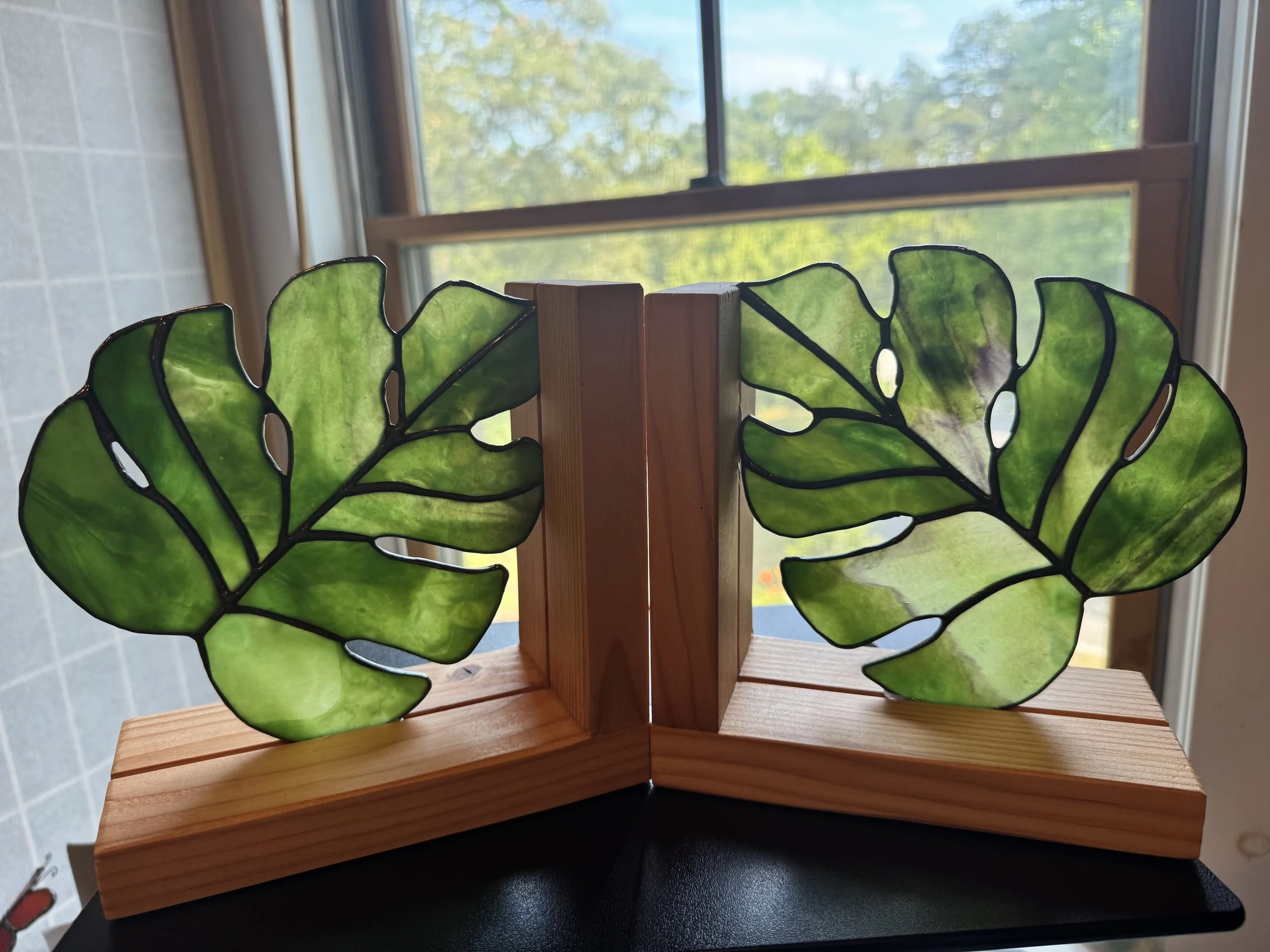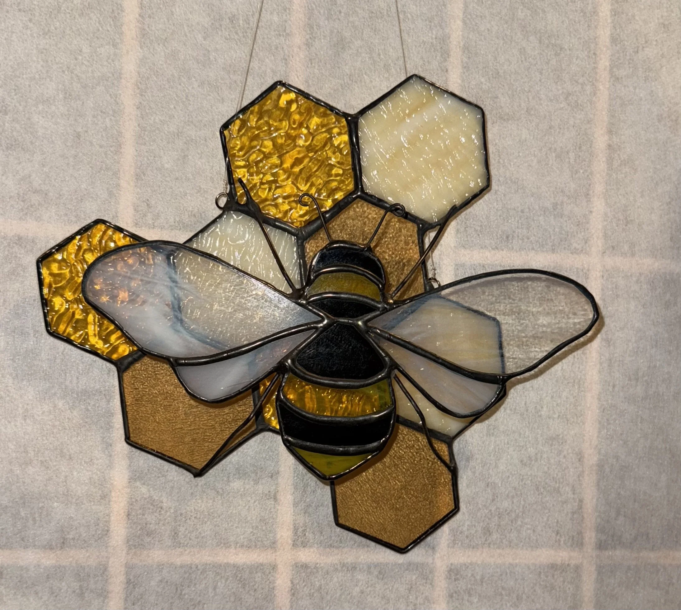 Karin makes a wide variety of stained glass pieces including plant stakes, spinners, garden decor, panels, bookends, three-dimensional pieces, and more. There are rarely more than a few of each item, with many pieces being one-of-a-kind. While some items are shown here, she regularly updates Instagram and Facebook with new creations.